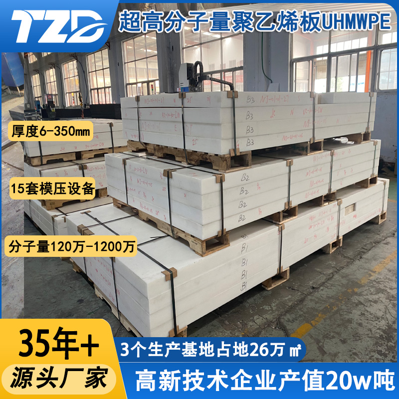 超高分子量聚乙烯板(Ultra-High Molecular Weight Polyethylene, UHMWPE)是一种分子量超过150万的热塑性工程塑料,采用高温高压工艺一体成型,具有卓越的耐磨性、抗冲击性、自润滑性、耐化学腐蚀性及低温韧性,可以代替传统碳钢,不锈钢,青铜等材料,广泛应用于工业、运输、矿山、医疗、体育等领域。超高分子量聚乙烯UHMWPE加工性能好,可通过数控加工制做各种机械的精密零部件,包括食品机械的齿轮、蜗轮、蜗杆、轴承。化工中做泵、阀门、档板、滤板。医疗上,还可用于短形外科零件。体育上做滑冰地板、滚地球道、滑雪板、机动雪橇零件。