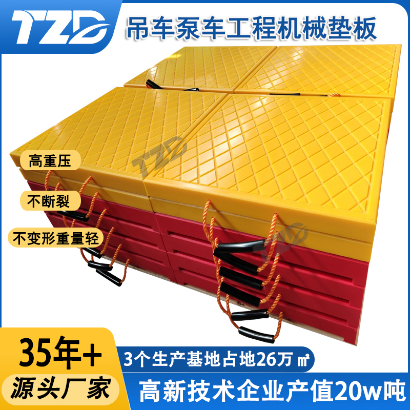概述:支腿垫板是用于垫在工程机械支腿下方提供支撑的工业产品,产品由板状垫板本体和尼龙手提绳构成,主要应用于建筑工程、桥梁施工、港口机械、采矿冶金等领域。该产品通过分散机械载荷增大受力面积,防止地面塌陷并确保作业安全,适配吊车、泵车、起重机等设备。采用高分子聚乙烯UHMWPE材质模压成型,具有防滑,耐磨,高